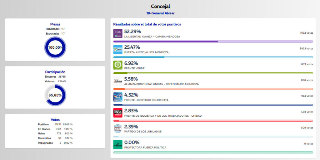 Con los resultados de las Elecciones Legislativas del domingo en General Alvear el Frente La Libertad Avanza + Cambia Mendoza consiguió cuatro bancas de las cinco en juego. La restante quedó en manos del Frente Fuerza Justicialista Mendoza.