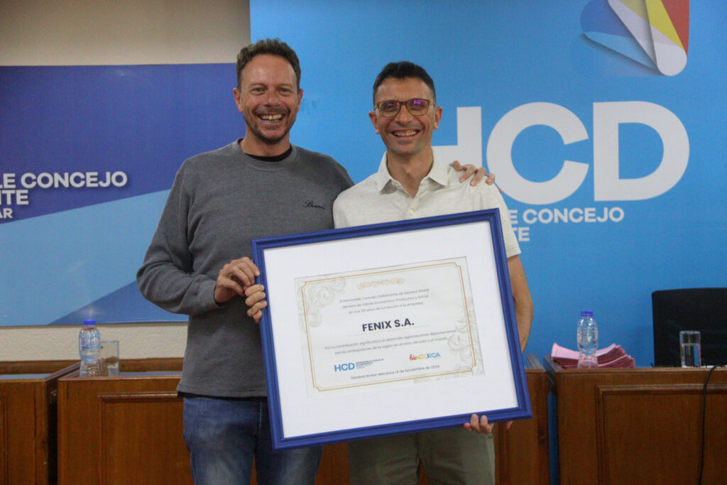 Durante la jornada, también se realizó la entrega de un reconocimiento especial mediante el cual se declaró de Interés Económico, Productivo y Social, en el marco de su 30º aniversario, a la empresa Fenix S.A. por su destacada trayectoria y su valioso aporte al desarrollo agroindustrial del departamento, siendo verdaderos embajadores de la región en el país y el mundo.